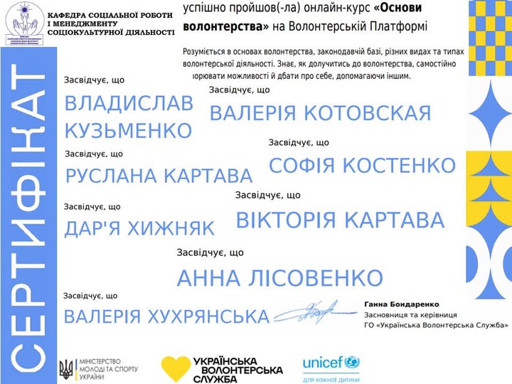 Студенти першого курсу спеціальності «Соціальна робота та консультування» долучилися до неформальної освіти, успішно пройшовши онлайн-курс з основ волонтерства. Отримані знання сприяють формуванню професійних компетентностей майбутніх соціальних працівників, зокрема: розвитку громадянської відповідальності, навичок міжособистісної взаємодії та командної роботи, усвідомленню ролі волонтерства у системі соціальної підтримки. Такі ініціативи підсилюють практичну складову підготовки студентів і створюють умови для їх активної інтеграції у волонтерський рух.