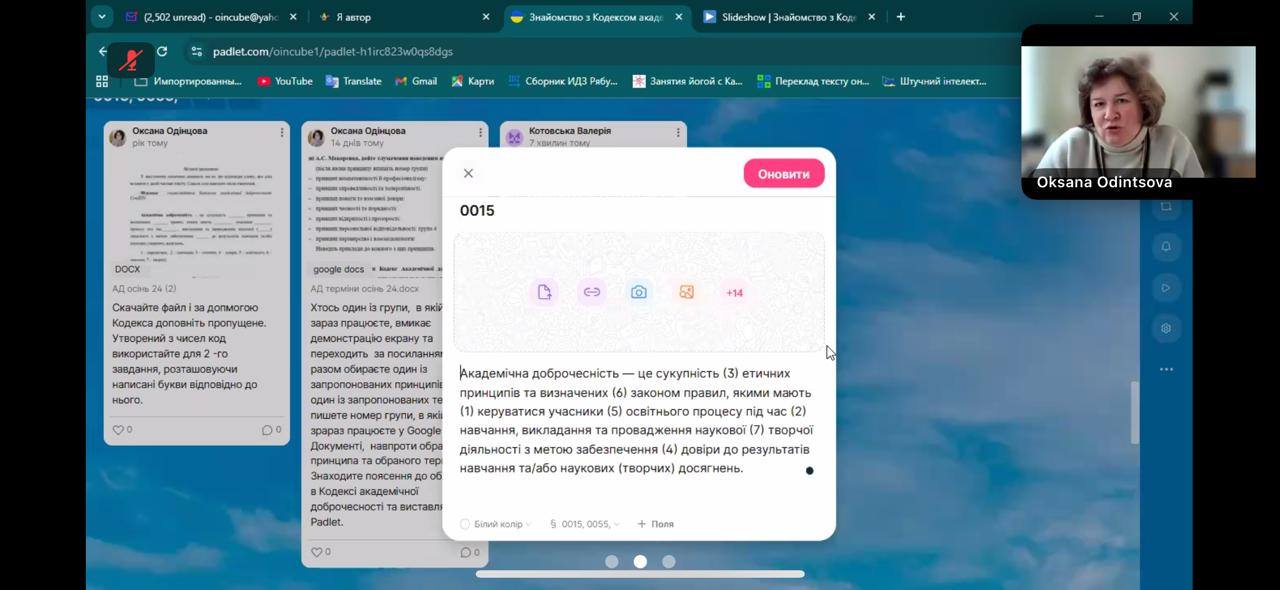 3.11.2025 здобувачі першого курсу спеціальності І10 "Соціальна робота та консультування" першого (бакалаврського) і другого (магістерського) рівнів вищої освіти взяли участь в онлайн-зустрічі, проведеній Центром забезпечення якості вищої освіти СумДУ щодо популяризації академічної доброчесності.