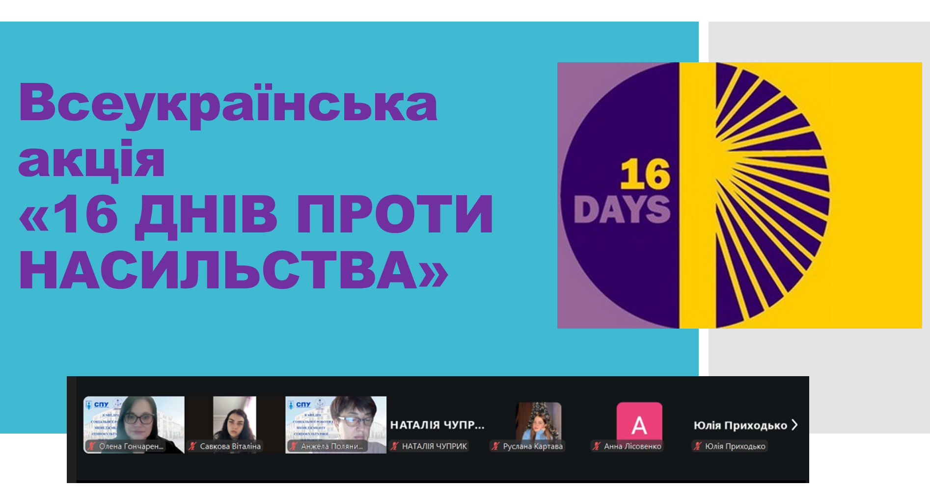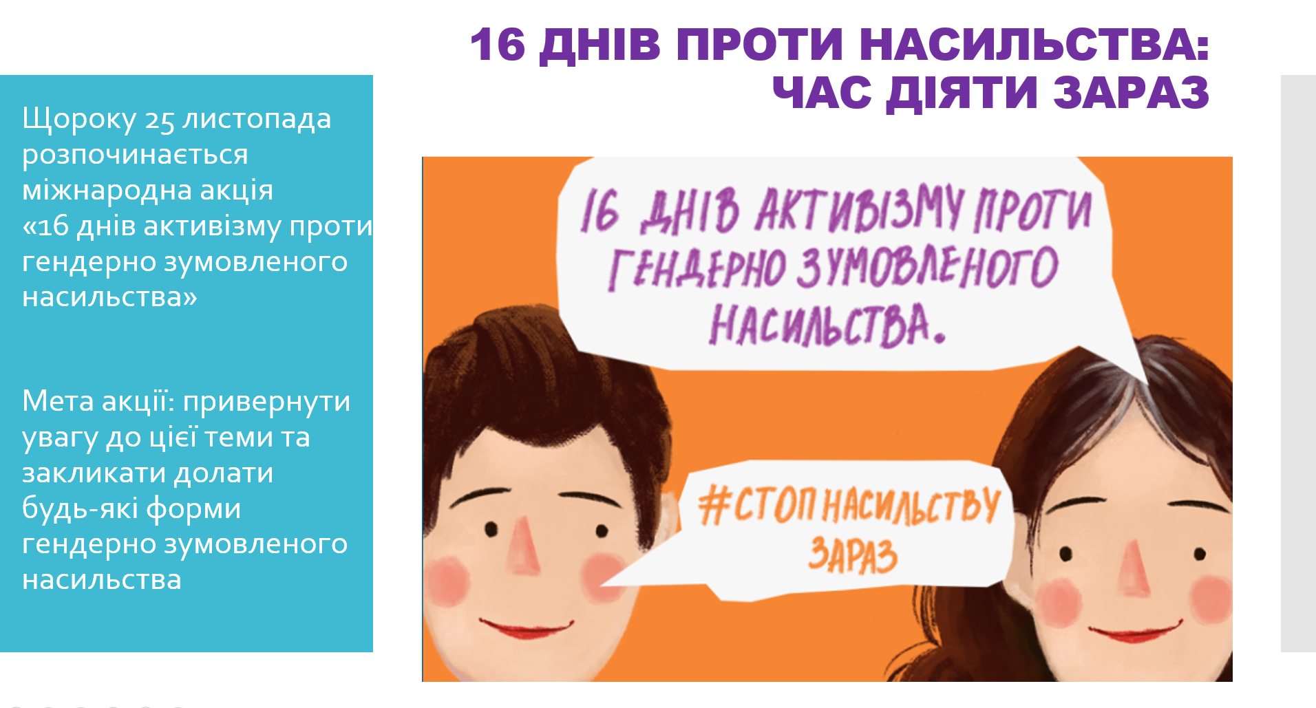 Акція має на меті об’єднати зусилля державних установ, громадських організацій та громадян для спільної протидії насильству, підвищити рівень обізнаності населення про права людини та можливості їх захисту.