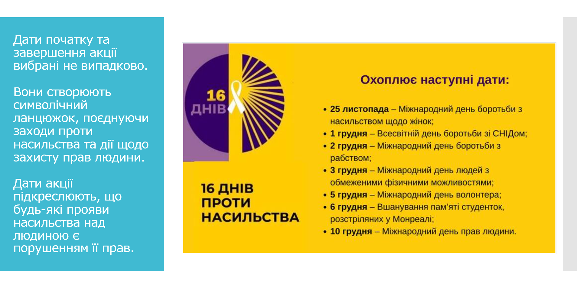 Дати початку та завершення Всеукраїнської акції вибрані не випадково. Вони створюють символічний ланцюжок, поєднуючи заходи проти насильства стосовно жінок та дії щодо захисту прав людини, підкреслюючи, що будь-які прояви насильства над людиною, незалежно від її статі, є порушенням прав людини.